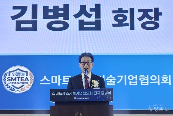 김병섭 '스마트제조기술기업협의회' 초대 회장이 25일 청주오스코에서 인사말을 하고 있다./ 사진 홍승태 기자